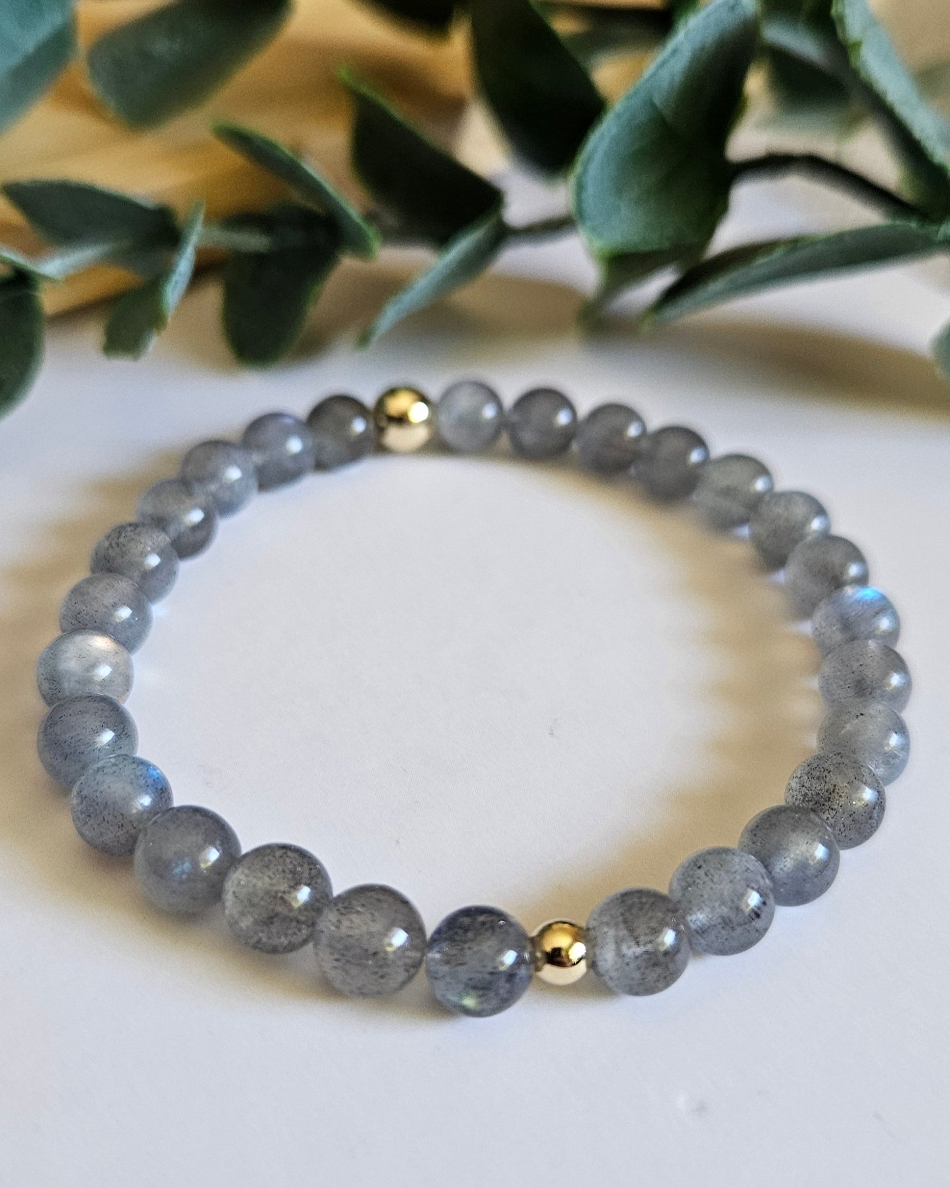 Aurora Veil shimmers with the shifting grey blue tones of Labradorite, accented by golden sparks like northern lights across a night sky. A bracelet of mystery and change, it encourages you to embrace transformation with confidence and intuition.