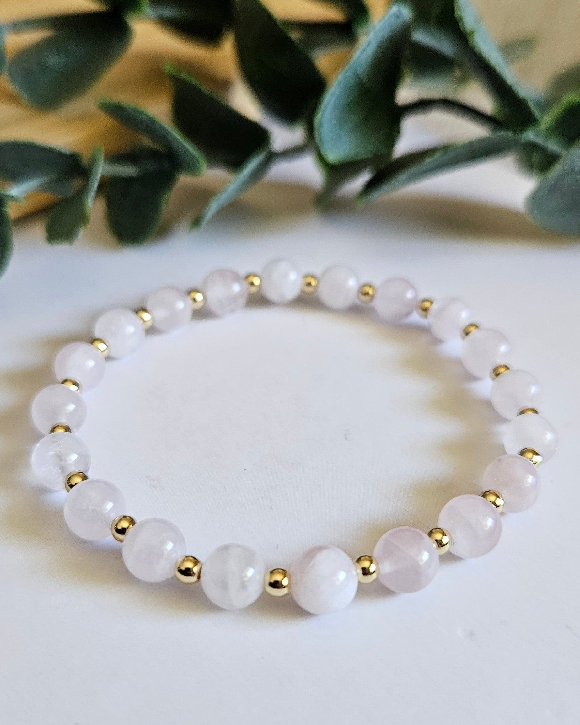 Heart Rhythm alternates the soft blush tones of Rose Quartz with 14k gold plated accents. Like the gentle glow of dawn, it carries the energy of love, compassion, and tenderness.