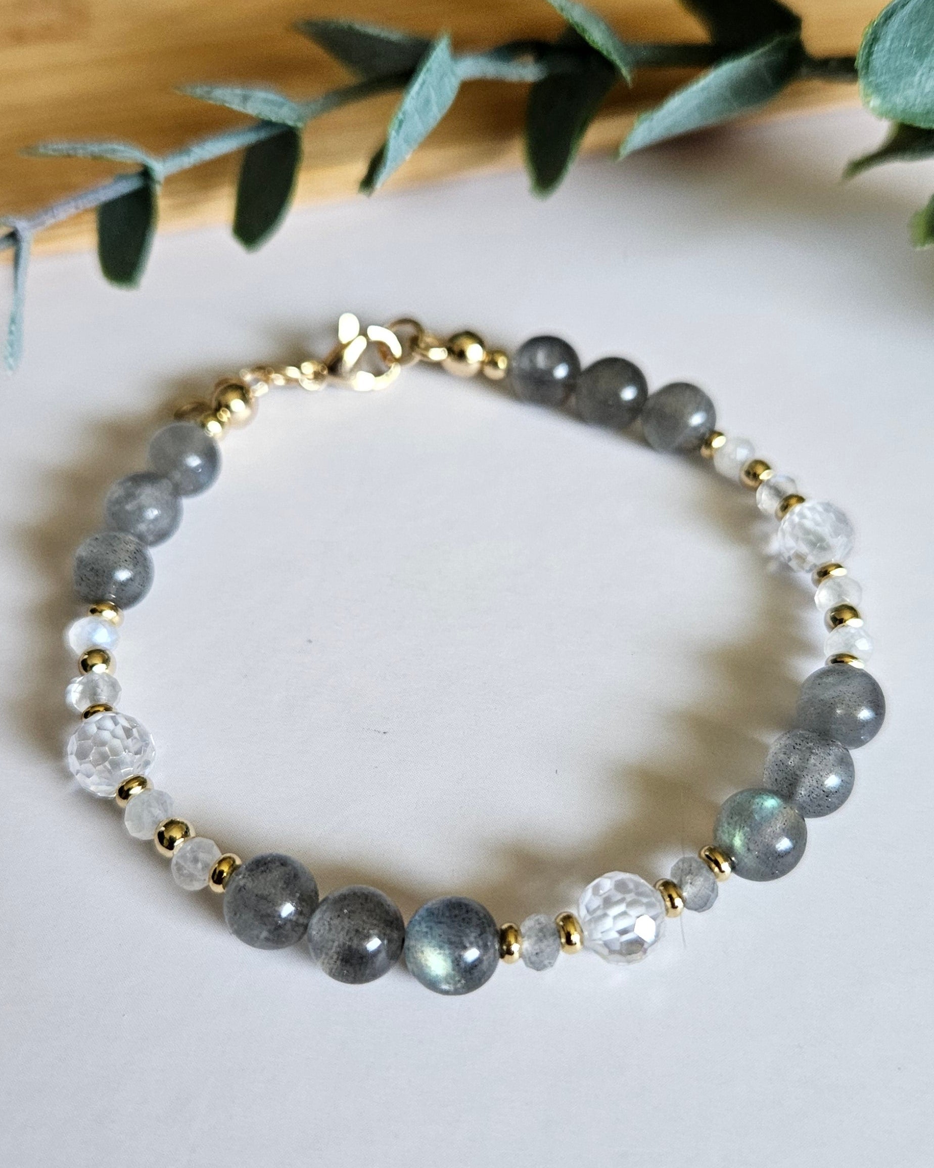 Moonlit Path is a bracelet for embracing change with grace and stepping into new beginnings. Crafted with 6 mm Labradorite, the sparkle of faceted cubic zirconia, 4 mm faceted rondelle Labradorite and Moonstone, and accented with 14k gold plated beads, it carries an energy that shifts and shimmers like moonlight on water. The interplay of iridescent greys, soft whites, and golden light invites both mystery and clarity into your journey.